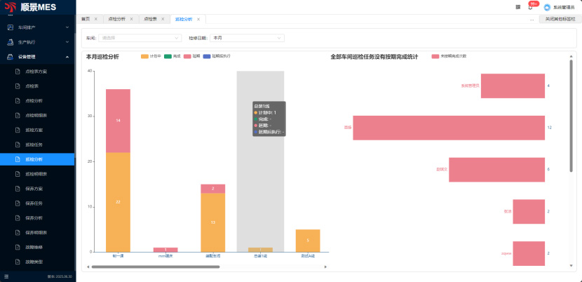 建立自动化点检系统,每日定时生成巡检任务,通过物联网实时监测设备运行状态,应用终端设备进行机台巡检,通过可视化报表查看设备的运行状态/点检状态;