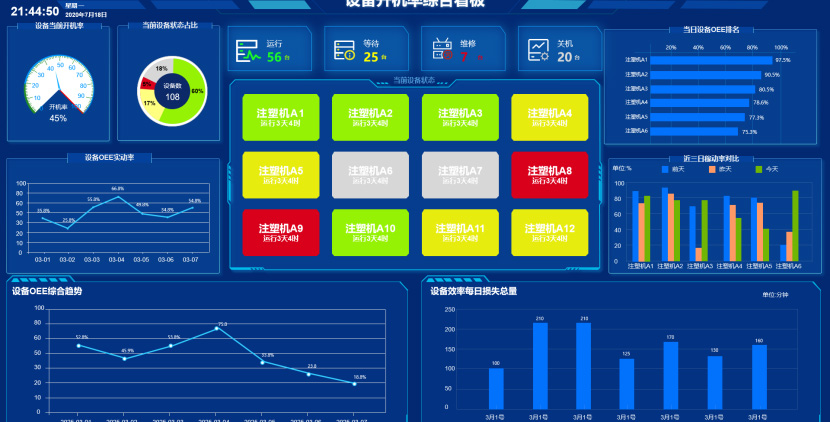 设备综合看板集成展示:实时设备状态、OEE综合效率(含实动率及趋势分析)、每日效率损失统计、当日OEE排名及近三日稼动率对比数据。